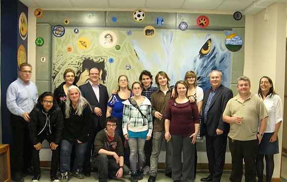 Les représentants du conseil d’établissement et les élèves artistes, en compagnie de la direction générale et de la Fondation de la CSRS. De gauche à droite, 1re rangée : Andres Diaz, Geneviève Reesör (Organisme MURIRS), Jonathan Gosselin-Lacharité, Félicia Fontaine, Jeffrey Audet, Nancy Audet et Stéphane Croteau. 2e rangée : Christian Maratier, Joanne Letendre (directrice école Le Goéland), Michel Bernard (directeur général CSRS), Linda Couture (présidente conseil d'établissement école Le Goéland), Diego Fontaine, Kassandra Houle-Côté, Serge Audet (directeur général Fondation CSRS) et Francine Grenier.