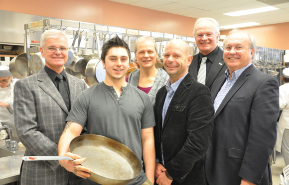 Sur la photo: Me Denis Paré (président Conseil des représentants de l'Estrie et vice-président conseil d'administration Mouvement Desjardins), Benoît Doucet-Martel (ancien élève participant au programme Propulsion jeunesse Desjardins), Marie-Claude Lunardi (directrice générale adjointe CSRS), Emmanuel Fournier (enseignant et agent de liaison école Mitchell-Montcalm), Robert Pouliot (maire suppléant Ville de Sherbrooke) et Serge Audet (Fondation de la CSRS).