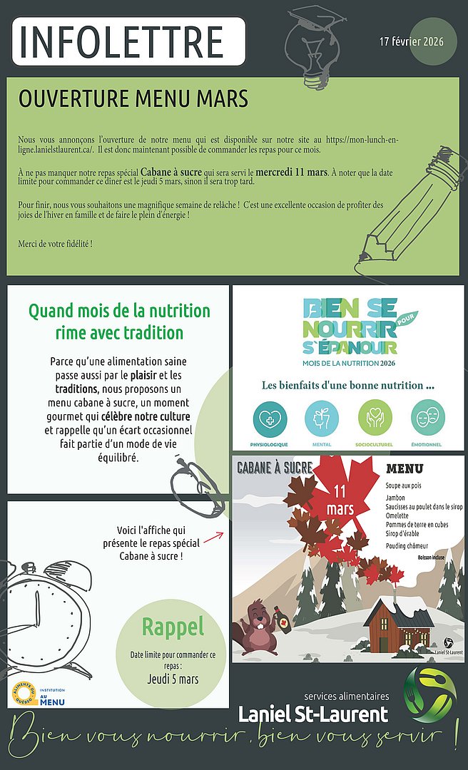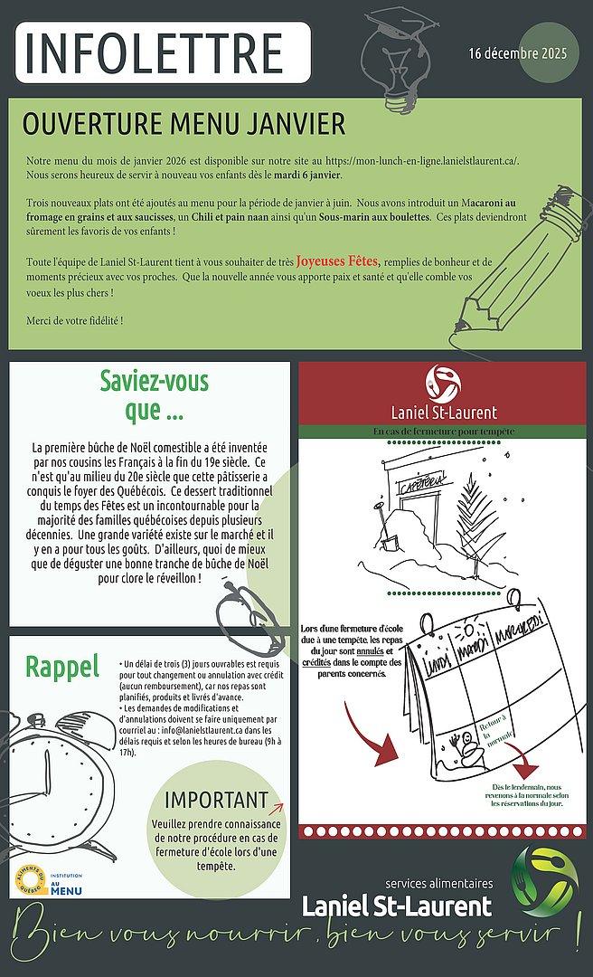 Nous vous invitons à consulter les menus proposés sur le site : www.lanielstlaurent.ca