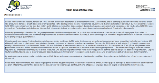 C’est en donnant une grande place à différentes valeurs comme le respect ainsi que le sens des responsabilités, de l’initiative et de l’autonomie que l’école Notre-Dame-du-Rosaire vise la réussite des élèves. Dans ses grandes orientations, l’école souhaite également :