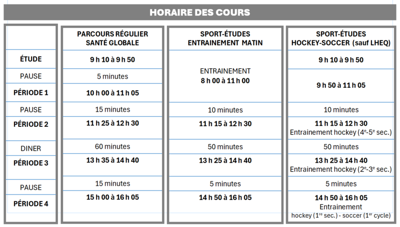 Les horaires des cours sont adaptés pour libérer des plages horaires dédiées à l'entraînement. En s’inscrivant, l’élève doit être conscient que le rythme d’apprentissage est plus rapide qu’en cheminement régulier. Le temps passé en classe est moindre. L’élève devra donc être investi et faire preuve d’autonomie.