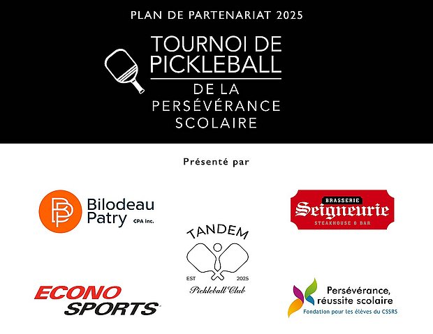 La Fondation pour les élèves du Centre de services scolaire de la Région-de-Sherbrooke a le plaisir de vous inviter à la première édition du Tournoi de pickleball présenté par Tandem Pickleball Club, Bilodeau Patry, Econosports et la Brasserie Seigneurie sous la présidence d’honneur de Sarah Vaillancourt, double médaillée d’or olympique.