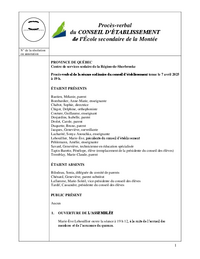 I t es du présiden nitial Procès-verbal du CONSEIL D’ÉTABLISSEMENT de l’École secondaire de la Montée I n i t ia les du directeur N° de la résolution ou annotation PROVINCE DE QUÉBEC Centre de…