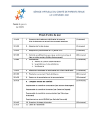 SÉANCE VIRTUELLE DU COMITÉ DE PARENTS TENUE LE 10 FÉVRIER 2021 Projet d’ordre du jour 19 h 00 1. Ouverture de la séance et vérification du quorum Mot de bienvenue et accueil des nouveaux membres …