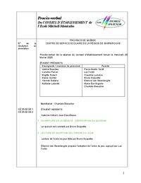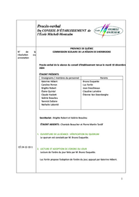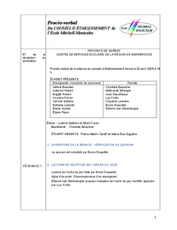 Procès-verbal Du CONSEIL D’ÉTABLISSEMENT de l’École Mitchell-Montcalm N° de résolution annotation la ou PROVINCE DE QUÉBEC CENTRE DE SERVICES SCOLAIRE DE LA RÉGION DE SHERBROOKE Procès-verbal de…