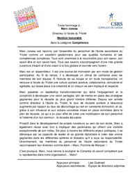 Texte hommage à : Marc Juneau Directeur à l’école du Triolet Mention honorable dans la catégorie Compétence Marc Juneau est reconnu par l'ensemble du personnel de l'école secondaire du Triolet comme…