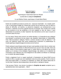Texte hommage à : Patrick Vallières Psychologue à l’école Notre-Dame-du-Rosaire Lauréat dans la catégorie Compétence (Lu par Mathieu Dubois, psychologue à l’école Marie-Reine) Patrick est considéré…