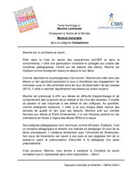 Texte hommage à : Maxime Lamirande Enseignant à l’école de la Montée Mention honorable dans la catégorie Compétence Maxime est un architecte du savoir… Pilier dans la mise en œuvre des programmes…
