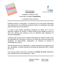 Texte hommage à : David Brassard Enseignant à l’école du Triolet Lauréat dans la catégorie Collaboration (Lu par Marc Juneau, directeur) Enseignant dévoué et responsable, il se démarque par sa très…