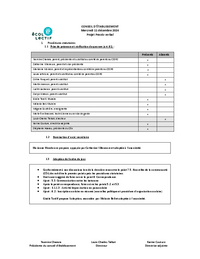 CONSEIL D’ÉTABLISSEMENT Mercredi 11 décembre 2024 Projet Procès-verbal 1. Procédures statutaires 1.1 Prise de présence et vérification du quorum (art. 61) : Présents Yasmine Charara, parent,…