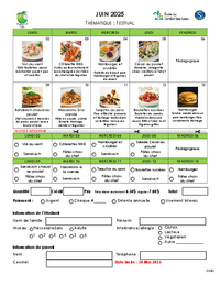JUIN 2025 THÉMATIQUE : FESTIVAL LUNDI MARDI 02 Vol-au-vent MERCREDI 03 Côtelette BBQ JEUDI 04 Cuites au four lentement accompagnée de l’idée du chef et de légumes 09 10 11 Pâte en coude,…