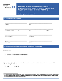 Formulaire de mise en candidature – Conseil d’administration du Centre de services scolaire de la Région-de-Sherbrooke (ci-après « CSSRS »)1 Membre représentant le personnel 1 – Identification du…