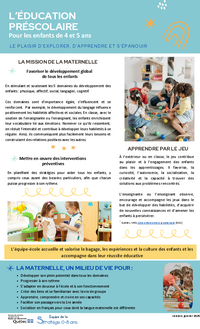 L’ÉDUCATION PRÉSCOLAIRE Pour les enfants de 4 et 5 ans LE PLAISIR D’EXPLORER, D’APPRENDRE ET S’ÉPANOUIR LA MISSION DE LA MATERNELLE Favoriser le développement global de tous les enfants En…