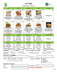 JUIN 2025 THÉMATIQUE : FESTIVAL LUNDI MARDI 02 Vol-au-vent MERCREDI 03 Côtelette BBQ JEUDI 04 Cuites au four lentement accompagnée de l’idée du chef et de légumes 09 10 11 Pâte en coude,…