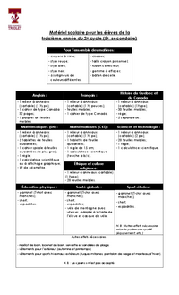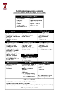 Matériel scolaire pour les élèves de la troisième année du 2e cycle (5e secondaire) Pour l’ensemble des matières : - crayons à mine; - stylo rouge; - stylo bleu; - stylo noir; - 6 surligneurs de…