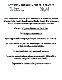INVITATION AU PIQUE-NIQUE DE LA RENTRÉE Pour célébrer la rentrée, pour rencontrer et échanger avec le personnel de l’école, tous les parents, les élèves et le personnel de l’école sont invités au…