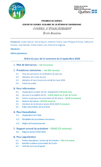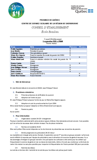 PROVINCE DE QUÉBEC CENTRE DE SERVICE SCOLAIRE DE LA RÉGION DE SHERBROOKE CONSEIL D’ÉTABLISSEMENT École Beaulieu Conseil d’établissement 3 septembre 2024 à 19h00 Procès verbal Nom Nadia Lapointe…