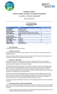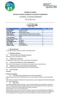 PROVINCE DE QUÉBEC CENTRE DE SERVICE SCOLAIRE DE LA RÉGION DE SHERBROOKE CONSEIL D’ÉTABLISSEMENT École Beaulieu Conseil d’établissement 24 octobre 2024 à 19h00 Procès verbal Nom Nadia Lapointe Jean…