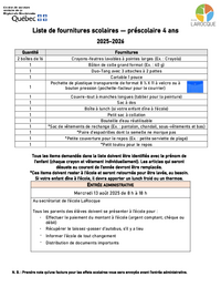 Respect – Engagement - Collaboration La collaboration est au cœur d’un milieu de vie sécurisant et stimulant pour permettre à chacun d’atteindre son plein potentiel. Fournitures scolaires 2025-2026 …