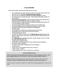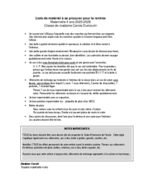 Liste de matériel à se procurer pour la rentrée Maternelle 4 ans 2025-2026 Classe de madame Carole Dumoulin • • • • • • • • • • Un couvre tout UNI pour l’aquarelle avec des manches qui ferment…