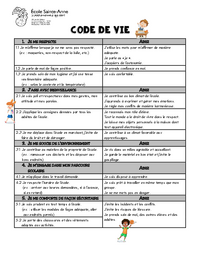 Code de vie 1. JE ME RESPECTE 1.1 Je m’affirme lorsque je ne me sens pas respecté. (ex. : moqueries, non-respect de la bulle, etc.) 1.2 Je parle de moi de façon positive. 1.3 Je prends soin de mon…