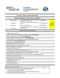 École Brébeuf 1875, rue Albert-Skinner, Sherbrooke (QC) J1J 1W8 Tél. : 819-822-5644 / Télécopieur: 819-822-5645 brebeuf@csrs.qc.ca 2e année - Année scolaire 2025-2026 Manuels scolaires à se procurer…