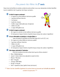 Aux parents des élèves de 1re année Dans le but de faciliter la rentrée scolaire de votre enfant, nous vous demandons de bien identifier tout le matériel et de l’organiser de la façon suivante : …