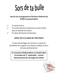 Inscris-toi au programme d’écriture littéraire du CSSRS en parascolaire! Tu aimes écrire… Tu as des textes qui dorment ou sont cachés dans le fond de tes tiroirs… Tu rêves de devenir écrivain(e)……