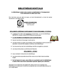 BIBLIOTHÈQUE MONTCALM La bibliothèque scolaire est un service complémentaire à l’enseignement et un instrument de culture pour tous. Elle n'est donc pas une salle de repos, un local d'encadrement,…