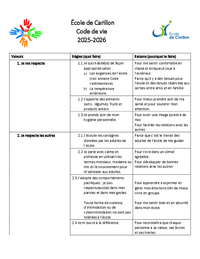École de Carillon Code de vie 2025-2026 Valeurs 1. Je me respecte 2. Je respecte les autres Règles (quoi faire) Raisons (pourquoi le faire) 1.1 Je suis habillé(e) de façon appropriée selon : a)…