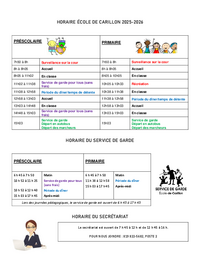 HORAIRE ÉCOLE DE CARILLON 2025-2026 PRÉSCOLAIRE PRIMAIRE 7h50 à 8h Surveillance sur la cour 7h50 à 8h Surveillance sur la cour 8h à 8h05 Accueil 8h à 8h05 Accueil 8h05 à 11h02 En classe …