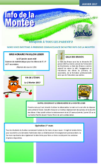 JANVIER 2017 BRIS HORAIRE PAVILLON LEBER Le 27 janvier avant-midi Examen de mathématique pour les élèves de 3e, 4e et 5e secondaire. (Reprise des cours à 13h) GALA DES BRAVOS Le Gala des Bravos…