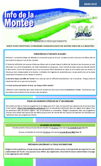 MARS 2019 PERSÉVÉRANCE ET RÉUSSITE SCOLAIRE ! Attention ! La dernière étape est débutée et se poursuit jusqu’au 21 juin. La table est donc mise pour les élèves afin de tout mettre en place en vue de…