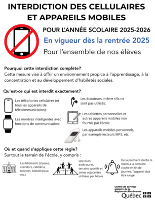 L’usage de l’appareil est permis en début et en fin de journée, avant la première cloche et après la dernière cloche. Il sera aussi permis à des fins pédagogiques selon la planification de l’enseignant.